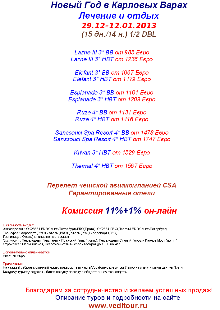 20 Дек 2012 17:18:45 ЧЕХИЯ - Карловы Вары 29.12-12.01 на Новый Год - Лечение и отдых, ком. 11%+1% от фирмы VEDI TOUR GROUP