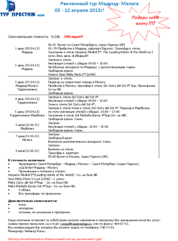 14 Янв 2013 14:18:46 ИСПАНИЯ. РЕКЛАМНЫЙ ТУР: Мадрид-Малага с 05 по 12 апреля 2013 от фирмы ТУР ПРЕСТИЖ