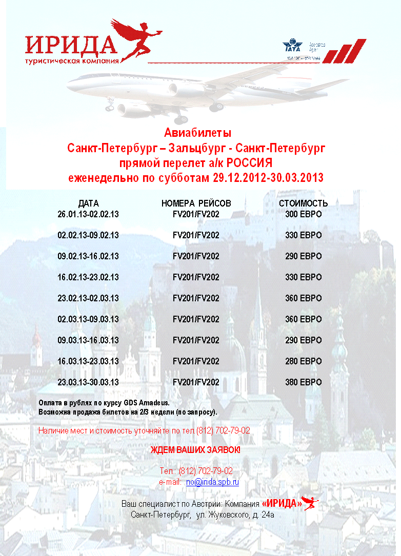 18 Янв 2013 16:04:22 АВИАБИЛЕТЫ СПБ-Зальцбург-СПБ, еженедельно по субботам до 30.03 от фирмы ИРИДА