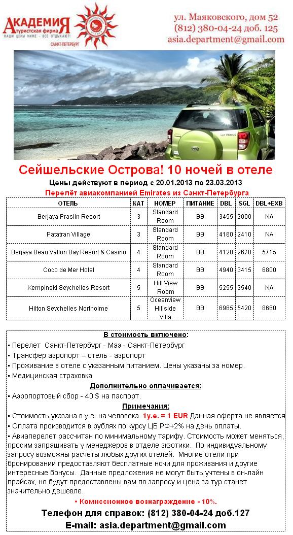 19 Янв 2013 13:20:02 СЕЙШЕЛЫ, 10н от 1730 EUR, Бесконечные пляжи и t воды в океане +26C от фирмы АКАДЕМИЯ