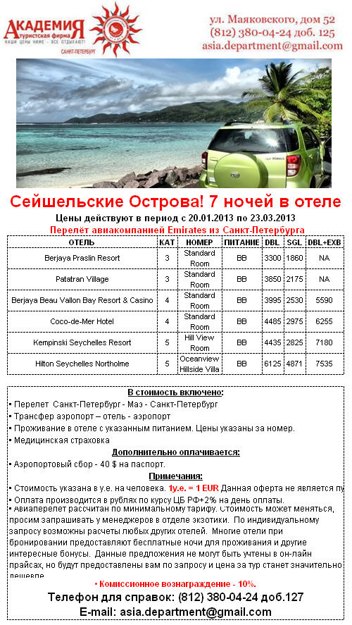 23 Янв 2013 18:07:46 СЕЙШЕЛЫ, 10н от 1730 EUR, Бесконечные пляжи и t воды в океане +26C от фирмы АКАДЕМИЯ