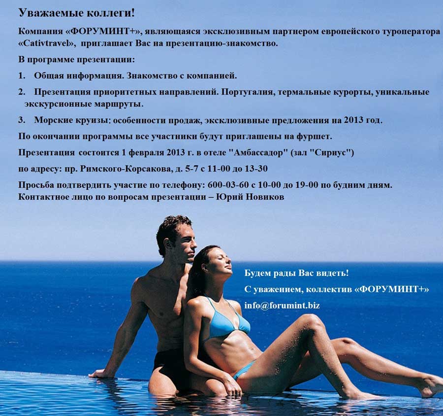 25 Янв 2013 11:53:51 СЕМИНАР-ПРЕЗЕНТАЦИЯ 01.02. по Португалии и круизам от фирмы ФОРУМИНТ ПЛЮС