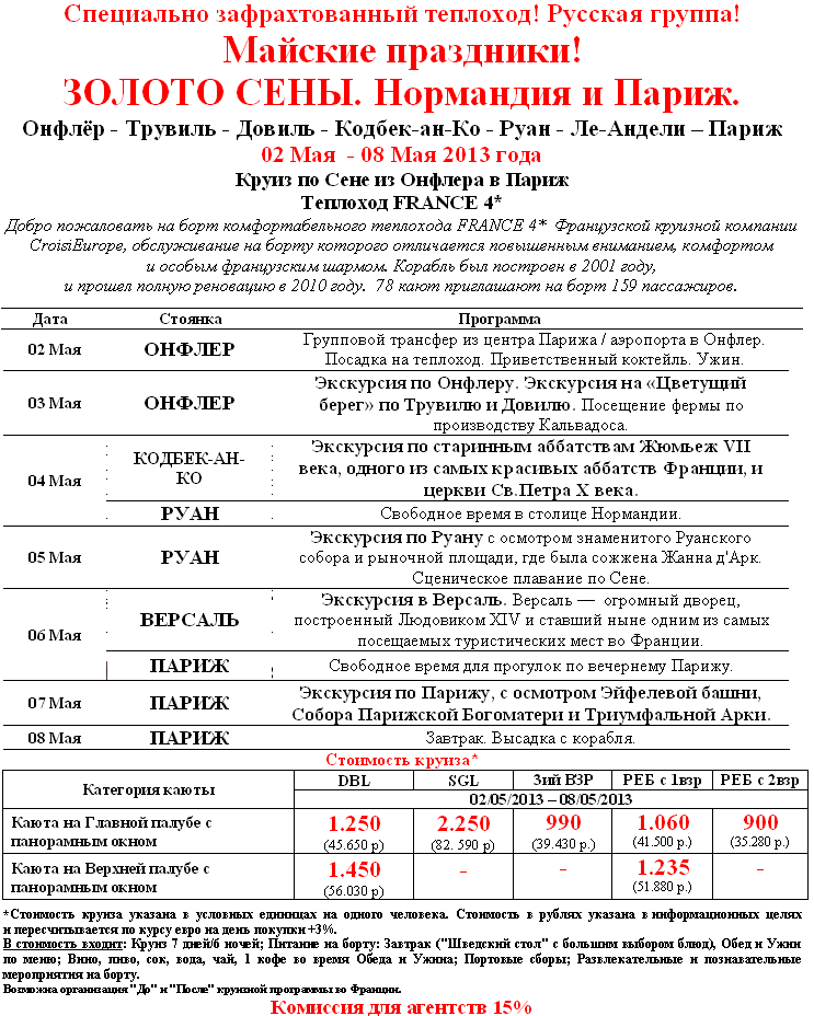 ФРАНЦИЯ 02.05-08.05 Круиз ЗОЛОТО СЕНЫ: Париж и Нормандия. РУССКАЯ ГРУППА, ком. 15% от фирмы НИКА |