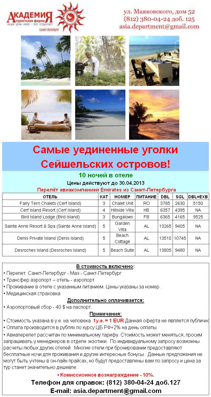 31 Янв 2013 11:40:31 СЕЙШЕЛЫ: Уединенные уголки Сейшельских островов 10 ночей от 1895 EUR от фирмы АКАДЕМИЯ
