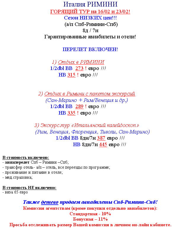 08 Фев 2013 14:21:38 ИТАЛИЯ РИМИНИ 16.02 и 23.02 от 273 евро (вкл. перелет) от фирмы ИНТУРИСТ