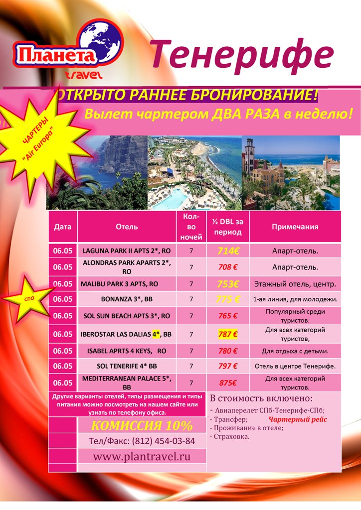 ИСПАНИЯ - ТЕНЕРИФЕ Раннее Бронирование от 28.900 руб Вылеты чартерами от фирмы ПЛАНЕТА TRAVEL |