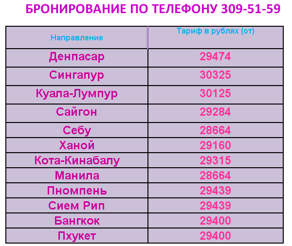ЮВА - Авиабилеты из СПб, Москвы, Иркутска, Владивостока от фирмы DIAMOND TOURS |