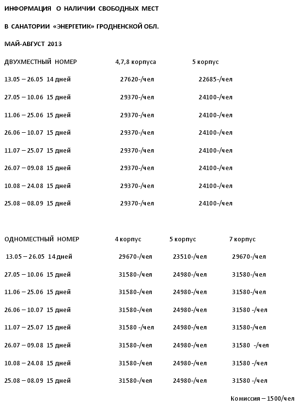 24 Апр 2013 22:40:05 БЕЛОРУССИЯ сан. Энергетик - май-август, сводка мест от фирмы АРМИДА