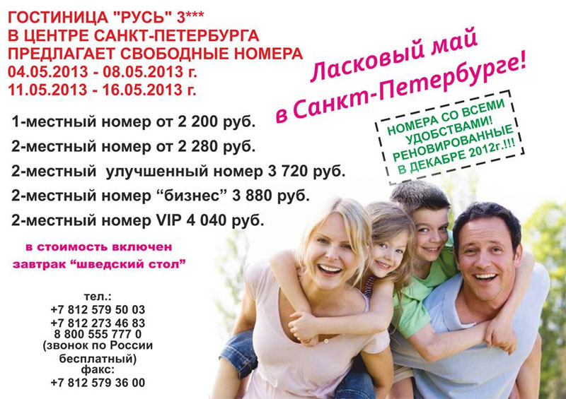 30 Апр 2013 16:22:47 РОССИЯ Санкт-Петербург - гост. РУСЬ спо на 04.05-08.05, 11.05-16.05 от фирмы ГОСТИНИЦА РУСЬ