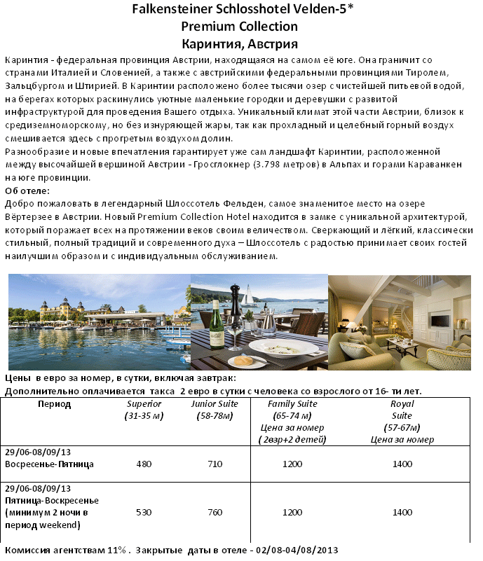 АВСТРИЯ, Каринтия, отель Schlosshotel Velden 5* от фирмы ХЕЛЕН ТУРС |