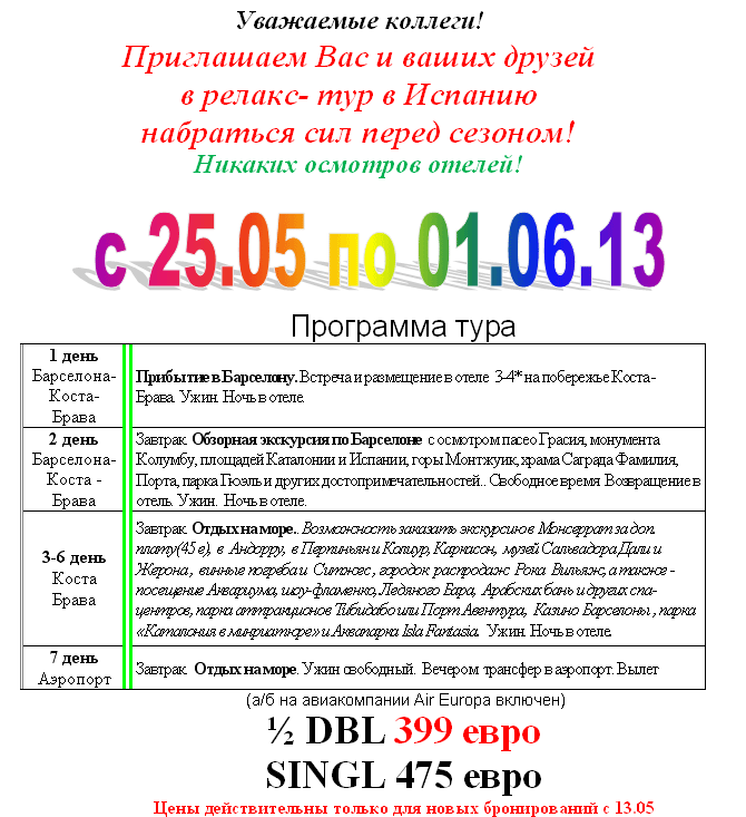 13 Май 2013 15:42:20 ИСПАНИЯ Релакс тур 25.05-01.06 за 399 евро от фирмы ИВОЛГА