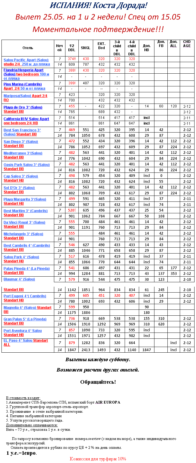 15 Май 2013 14:56:13 ИСПАНИЯ Коста Дорада 25.05 на 1 и 2 нед - от 374 евро от фирмы ИВОЛГА