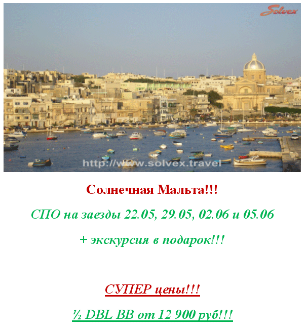 МАЛЬТА 29.05, 02.06, 05.06 от 12 900 руб на чел + экскурсия в подарок от фирмы СОЛВЕКС |