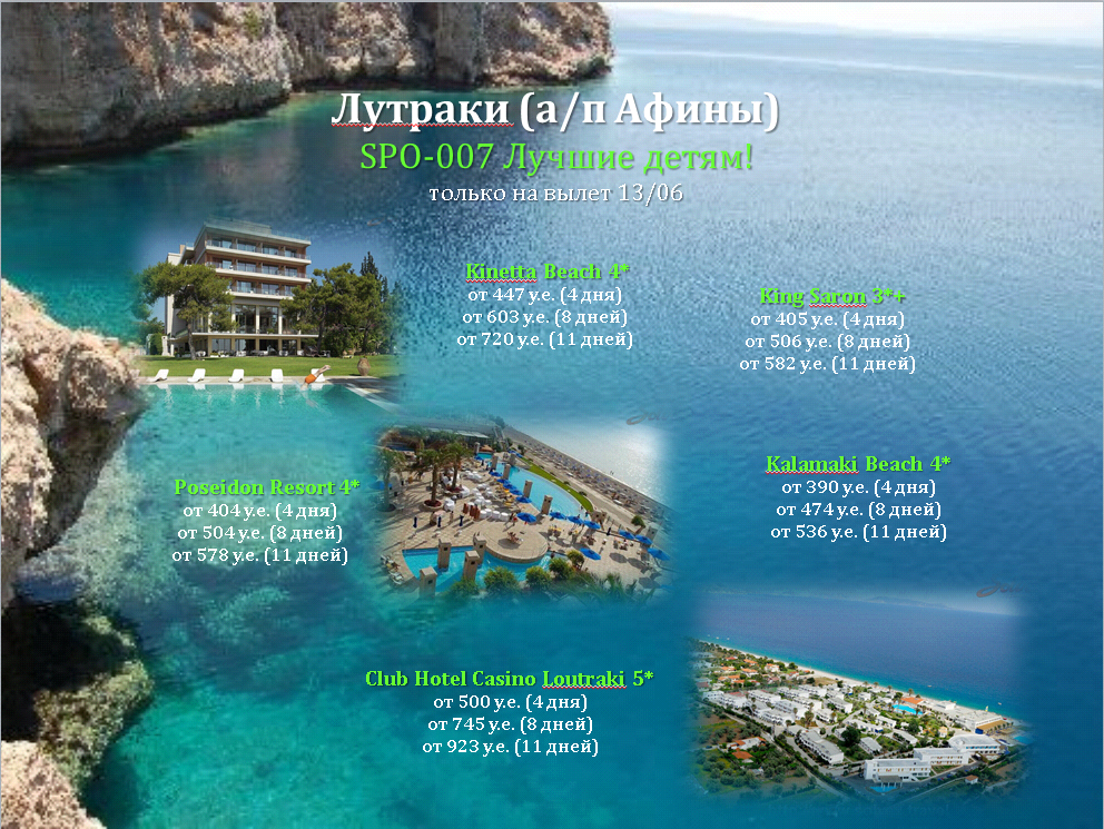 ГРЕЦИЯ Лутраки. (а/п Афины). SPO-007 Лучшие детям! только на 13.06 от фирмы СОЛВЕКС