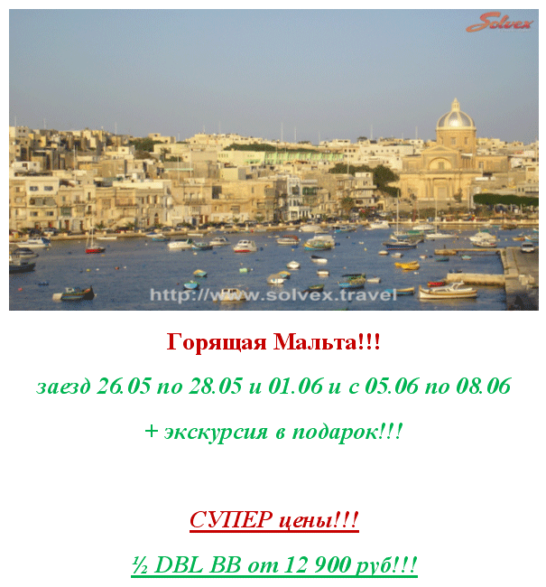 22 Май 2013 12:42:49 МАЛЬТА 26.05 от 12 900 руб + экскурсия в подарок от фирмы СОЛВЕКС