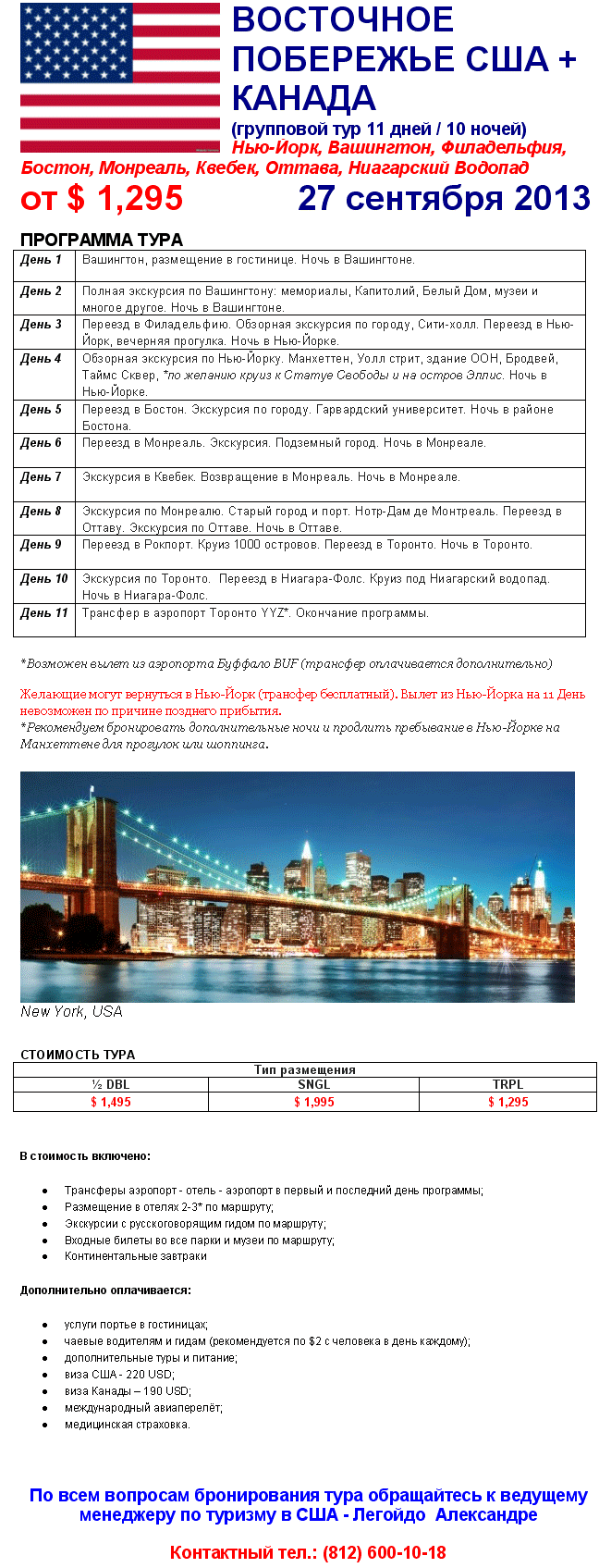 31 Май 2013 13:50:11 США-КАНАДА 27.09 на 11д Нью-Йорк - Вашингтон - Филадельфия - Бостон - Монреаль - Квебек - Оттава -Ниагарский Водопад от $1295 от фирмы АВАТАРА