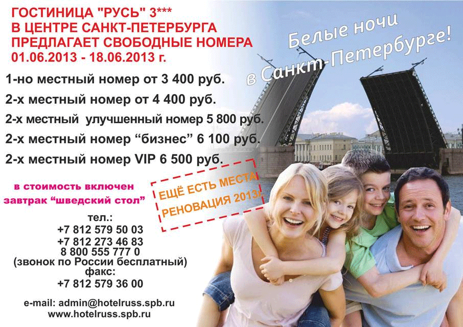 05 Июн 2013 14:26:26 РОССИЯ - СПБ - гост. РУСЬ 01.06-18.06 БЕЛЫЕ НОЧИ в СПб от фирмы ГОСТИНИЦА РУСЬ