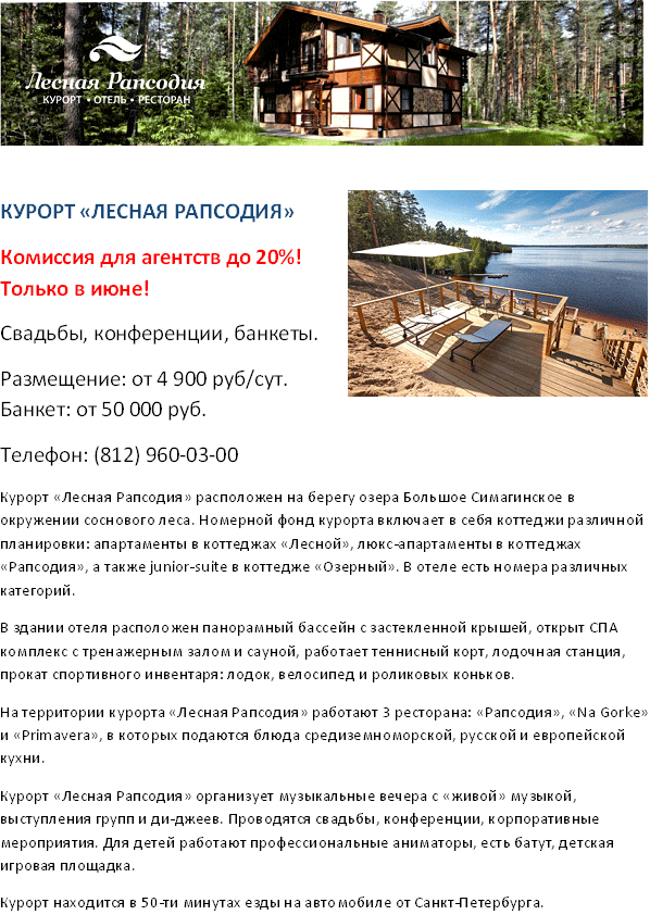 РОССИЯ. ЛенОбласть. Курорт "Лесная Рапсодия", ком. до 20% в июне от фирмы ЛЕСНАЯ РАПСОДИЯ |