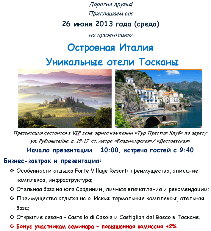 СЕМИНАР 26.06 ИТАЛИЯ - островная Италия, отели Тосканы, бонус участникам семинара ком. +2% от фирмы ТУР ПРЕСТИЖ |