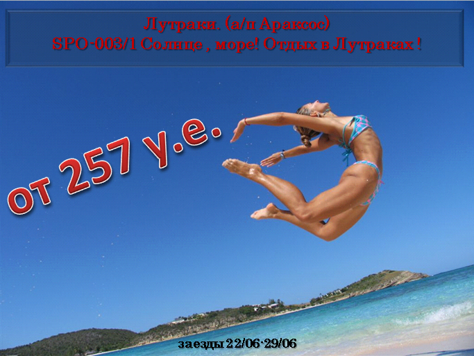 22 Июн 2013 17:15:19 ГРЕЦИЯ Лутраки (а/п Араксос) заезды 22/06-29/06 от 257 у.е. от фирмы СОЛВЕКС