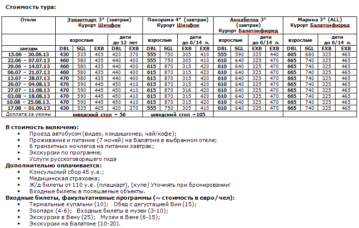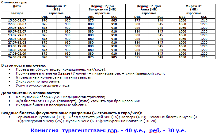 программе: МИШКОЛЬЦ – БУДАПЕШТ – БАЛАТОН – ЭГЕР* – ВЕНА –