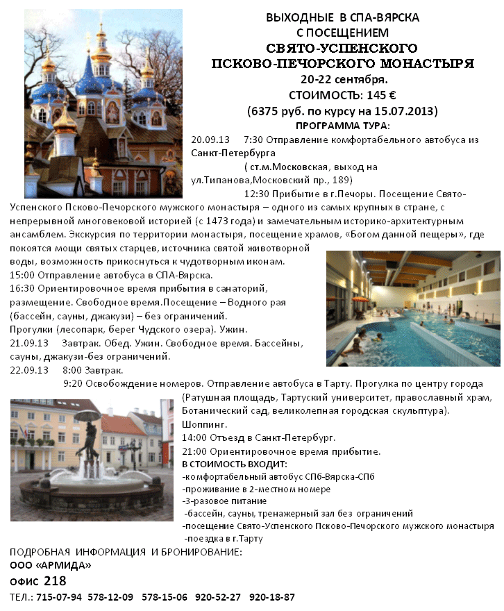 17 Июл 2013 13:38:33 ЭСТОНИЯ 20.09-22.09 СПА-Вярска+ Свято-Успенский Псково-Печорский монастырь - за 145 евро от фирмы АРМИДА