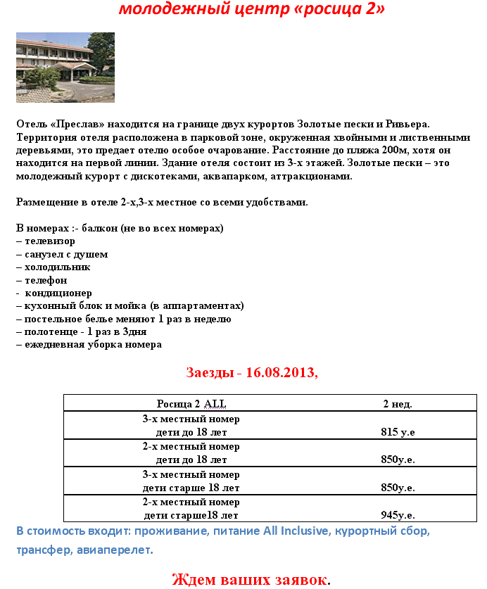 25 Июл 2013 15:29:09 БОЛГАРИЯ Молодежный центр РОСИЦА 2, с 16.08 от 815 у.е. от фирмы АСГАРД