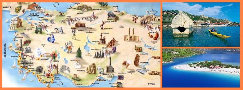 Анталия – Фаселис – Мира – Кекова – Каш – Ксантос – Фетхие – Каунос – Мармарис – Бодрум – Милет – Приена – Дидима – Кушадасы – Эфес – Афродисиас – Памуккале – Хиераполис – Анталия