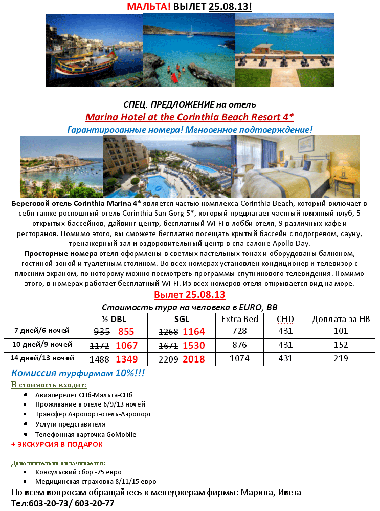 14 Авг 2013 12:40:29 МАЛЬТА 25.08 Marina Hotel at the Corinthia Beach Resort 4* от фирмы ИВОЛГА