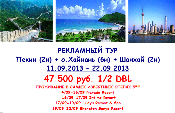 КИТАЙ 11.09-22.09 ПОСЛЕДНИЕ 2 МЕСТА в рекламном туре Пекин-Хайнань-Шанхай от фирмы ПИТЕРТУР |