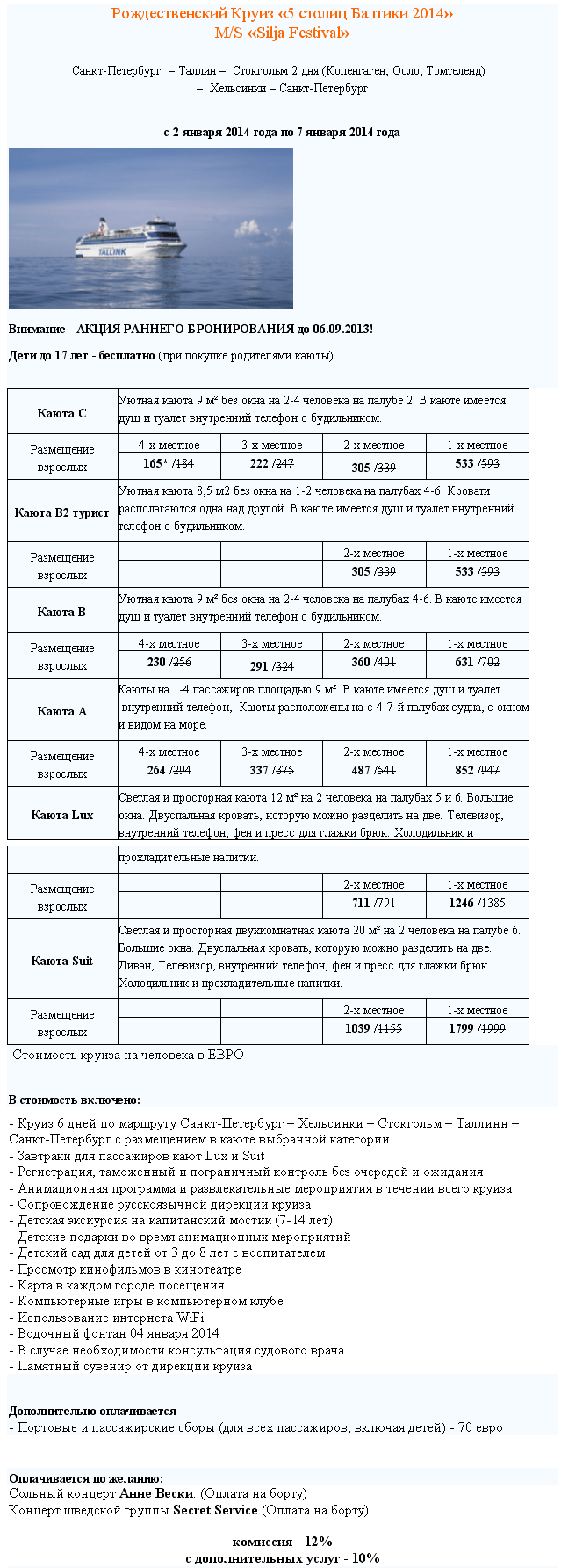26 Авг 2013 16:10:55 КРУИЗ, Скандинавия на Рождество 02.01-07.01 "5 столиц Балтики" на Silja Festival от фирмы ЭКСПО-ТУР