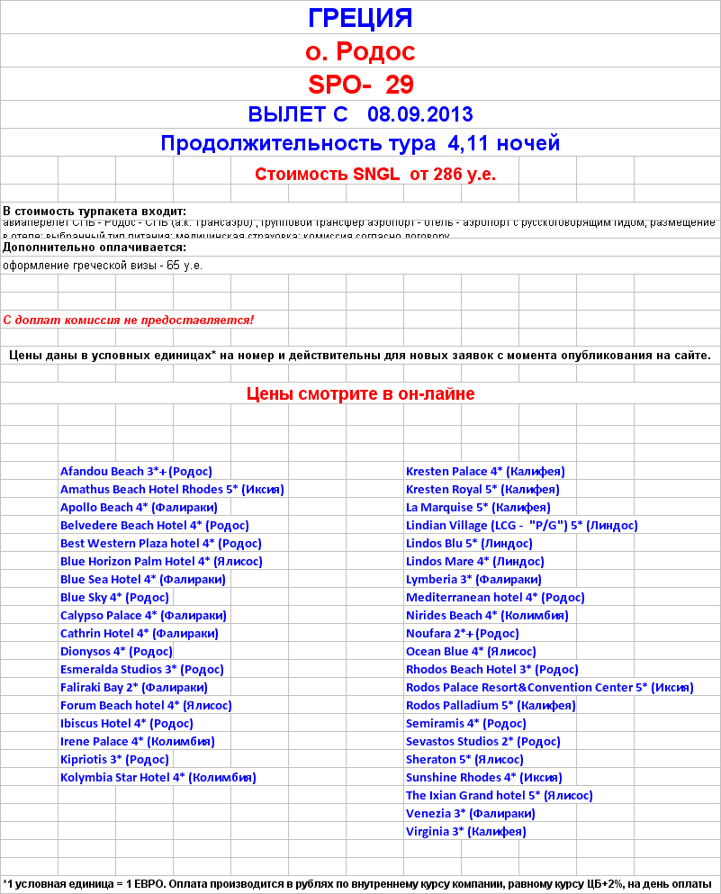 04 Сен 2013 12:36:38 ГРЕЦИЯ. Родос. Последнее место на 08.09.13 на 4 и 11 ночей от 286 у.е. от фирмы ЮЖНЫЙ КРЕСТ