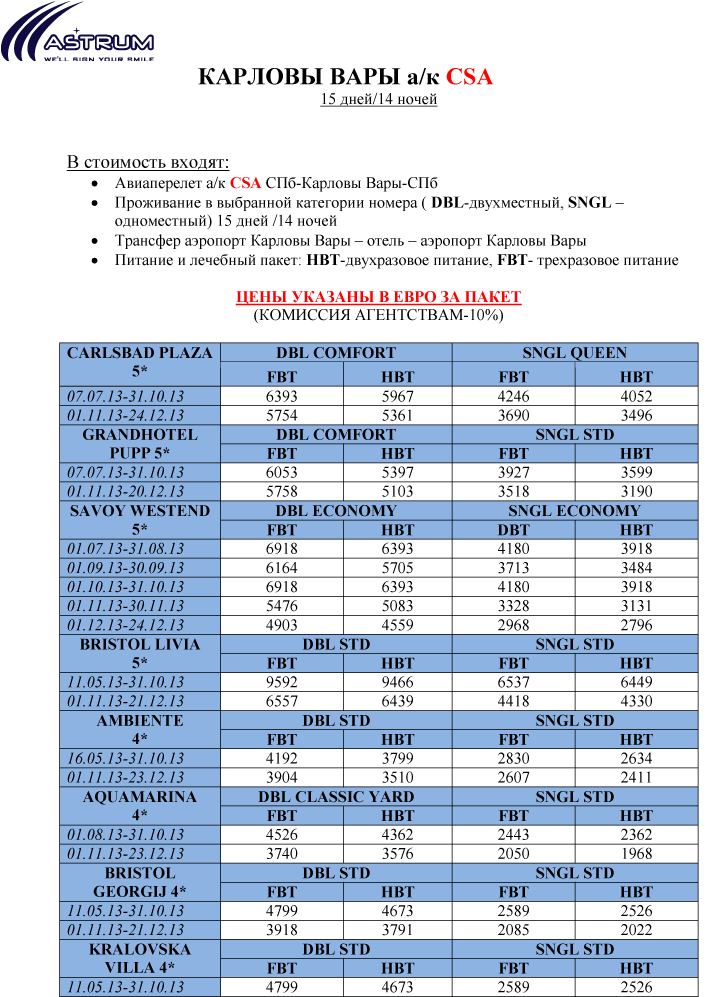 Рады представить Вашему вниманию цены на пакетные туры(15/14н ) в КАРЛОВЫ ВАРЫ!