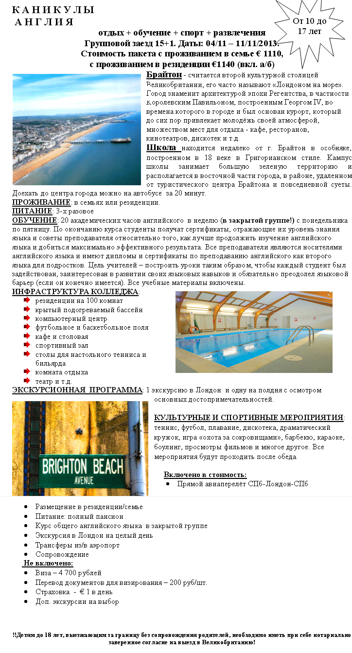 18 Сен 2013 12:48:52 АНГЛИЯ Брайтон 04.11-11.11 Детям отды-обучение-спорт-развлечения - групповой тур от фирмы ИМПЕРИАЛ