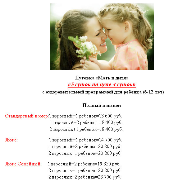 зайдите на наш сайт:  http://www.gelios-otel.ru/action/putevka-mat-i-ditya-v-budni-5-po-tsene-4
