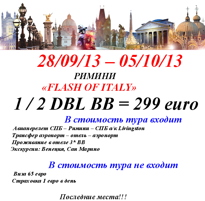 26 Сен 2013 13:01:35 ИТАЛИЯ, Римини 28.09-05.10 от 299 евро от фирмы ФЛАМИНГО