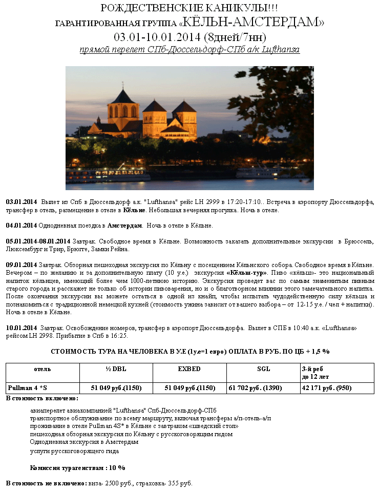 10 Окт 2013 15:53:32 ГЕРМАНИЯ-НИДЕРЛАНДЫ Кёльн-Амстердам 03.01-10.01 на Рождество, гарант. группа от фирмы АРТ-ТРЕВЕЛ