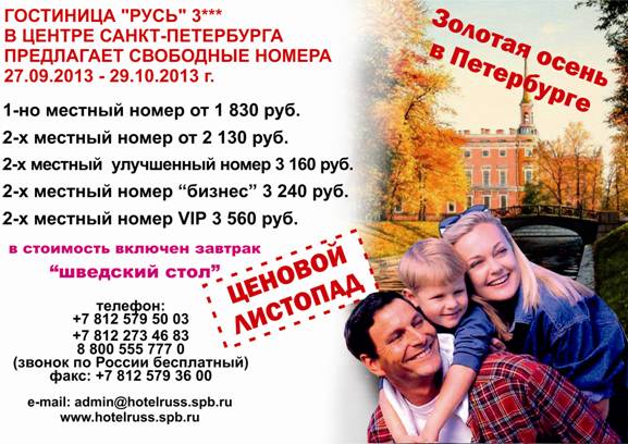 11 Окт 2013 11:07:31 РОССИЯ. СПБ - гост. РУСЬ: весь октябрь скидка 20% от фирмы ГОСТИНИЦА РУСЬ