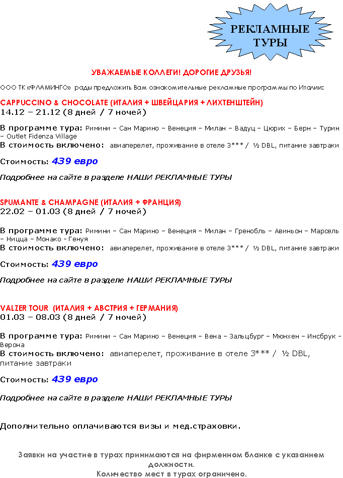 23 Окт 2013 23:10:24 ИТАЛИЯ и страны Европы - РЕКЛАМНЫЕ ТУРЫ с 14.12, 22.02, 01.03 от фирмы ФЛАМИНГО