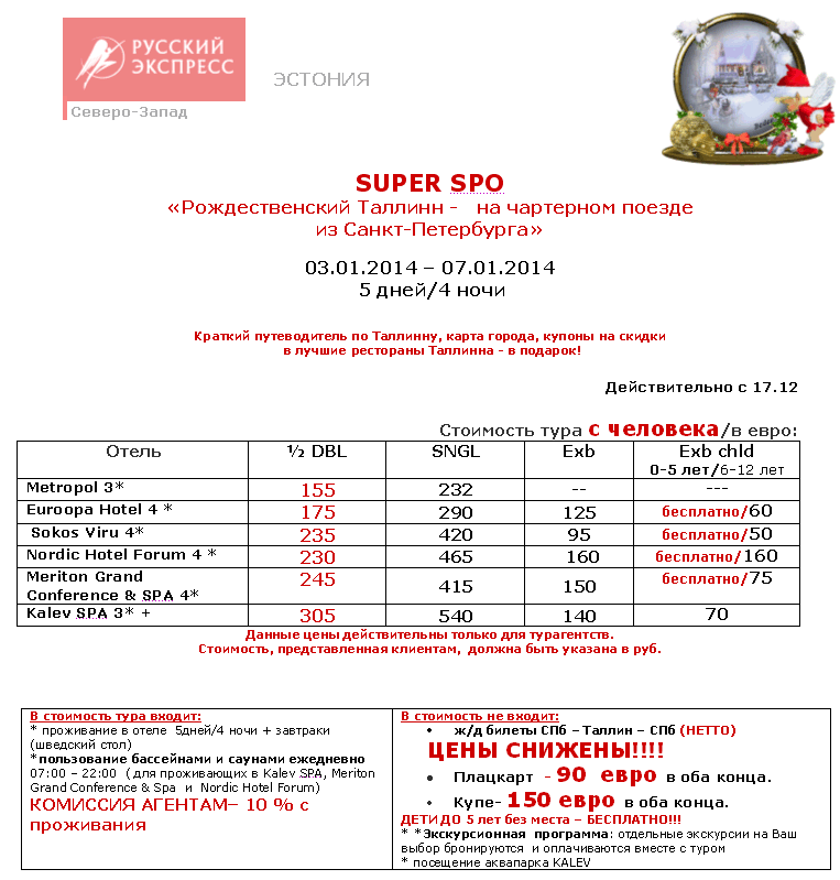 17 Дек 2013 12:26:26 ЭСТОНИЯ Таллин на Рождество 03.01-07.01 на чартерном поезде из СПб от фирмы РУССКИЙ ЭКСПРЕСС