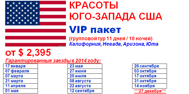США - групповой тур: Калифорния, Невада, Аризона, Юта. VIP пакет от 2395 usd от фирмы АВАТАРА |