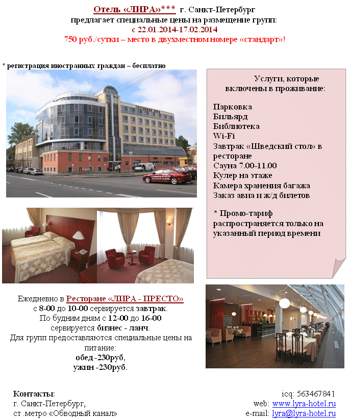 20 Янв 2014 12:24:38 РОССИЯ. СПб: размещение групп с 22.01.2014-17.02.2014 от фирмы ЛИРА ГРАНД