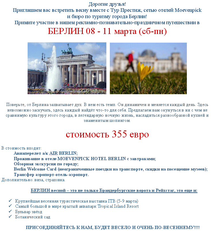 21 Янв 2014 14:54:56 ГЕРМАНИЯ Берлин 08.03-11.03 Рекламный Тур за 355 евро на ITB и Праздники от фирмы ТУР ПРЕСТИЖ