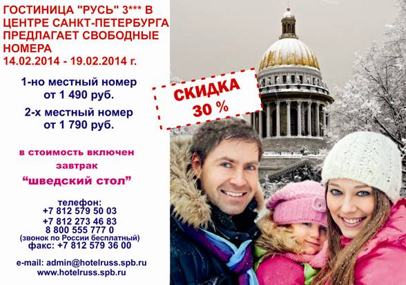 14 Фев 2014 15:33:34 РОССИЯ - СПБ - гост. РУСЬ - размещение с 14.02 по 19.02 от 895 руб. от фирмы ГОСТИНИЦА РУСЬ