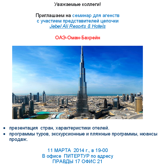 27 Фев 2014 12:39:19 СЕМИНАР 11.03 ОАЭ-Оман-Бахрейн с уч. предст. Jebel Ali Resorts & Hotels от фирмы ПИТЕРТУР