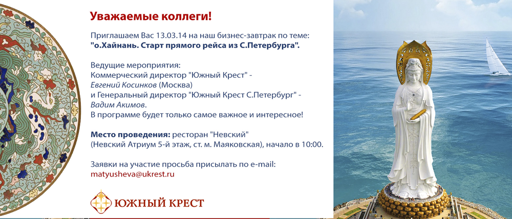 07 Мар 2014 17:38:42 СЕМИНАР 13.03 бизнес-завтрак "О.Хайнань. Старт прямого рейса из С.Петербурга" от фирмы ЮЖНЫЙ КРЕСТ