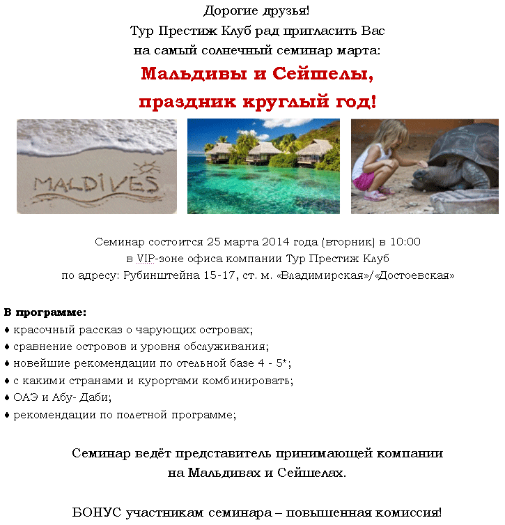 17 Мар 2014 11:58:45 СЕМИНАР 25.03 Мальдивы и Сейшелы - праздник круглый год - от фирмы ТУР ПРЕСТИЖ