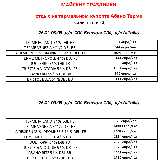 19 Мар 2014 11:42:59 ИТАЛИЯ Абано Терме на майские 26.04-03.05/09.05 от фирмы МЕРКУРИЙ