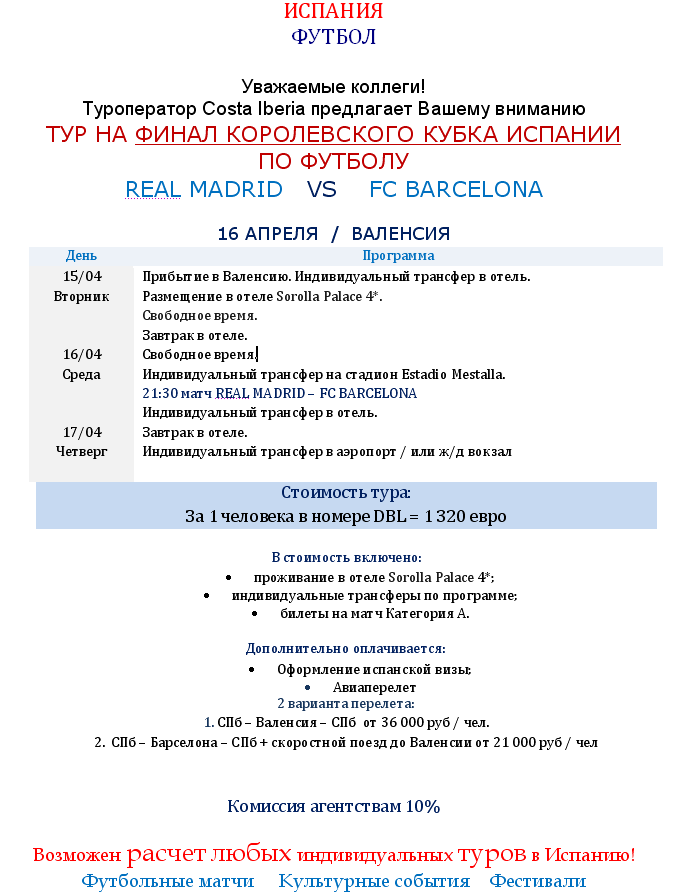 28 Мар 2014 04:28:58 ИСПАНИЯ Валенсия 15.04-17.04 Королевский Кубок по футболу, тур на финал - от фирмы COSTA IBERIA