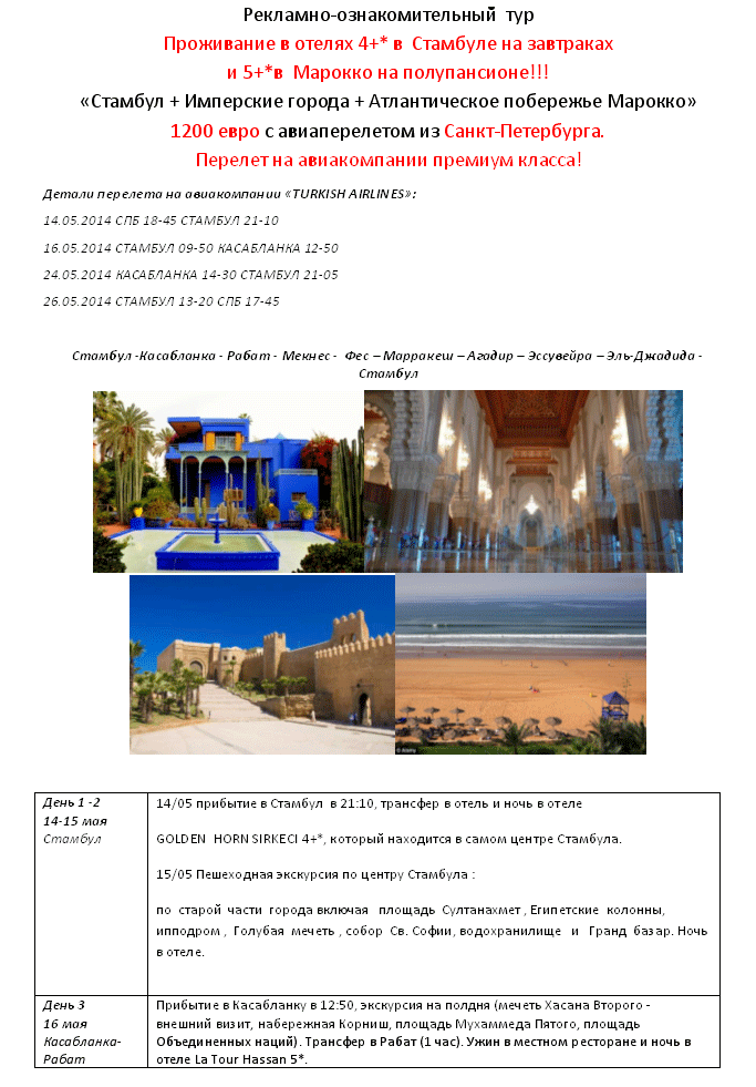 31 Мар 2014 12:52:36 МАРОККО-ТУРЦИЯ 14.05-26.05 Рекламный Тур за 1200 евро от фирмы ПИТЕРТУР